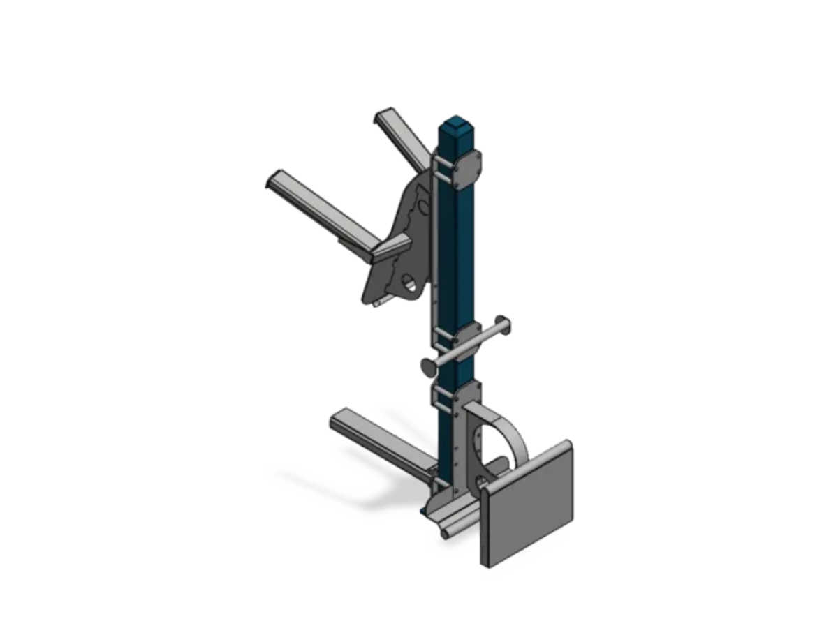 A single-post exercise system featuring a vertical knee raise and calf raise station on one side, and a plyo box with a support handle on the other. The plyo box height can be selected to suit different training needs.