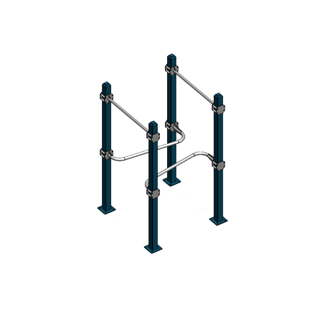 A square, four-post exercise system featuring 42-inch parallel bars and two 84-inch high straight pull-up bars.